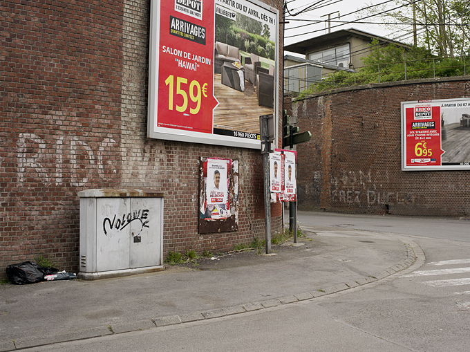 Voici les chevalements de Liévin, derrière la zone commerciale, avec leur « présence envoûtante », écrit Ari Blatt, mais seulement pour le regardeur étranger puisque, comme il le signale, ces objets sont devenus indifférents aux habitants. Thierry Girard sait mettre en évidence ces contrastes dans le paysage du bassin minier, les traces d’un passé révolu, et dont on peut être certain, qu’à part quelques anciens et les enseignants d’histoire, elles ne disent plus rien, comme ces slogans à la peinture toujours visibles sur les murs de brique, soixante ans plus tard, comme si les vieux communistes du coin avaient suivi sa proposition à propos de l’inscription « plateau insoumis » (voir Dans l’épaisseur du paysage, Loco, 2017) et s’en étaient venus régulièrement repeindre leurs murs à la gloire de Duclos et entretenir leur détestation de Rigway-la-guerre, général américain des années 50. Et au milieu de tout cela, la figure de Mélenchon, ses petites affiches sous les quatre par trois de Brico Dépôt, la photographie étant là pour mettre en évidence ces télescopages de l’histoire, ces collisions des temporalités, illustrant par ailleurs l’impossibilité d’une linéarité du temps.