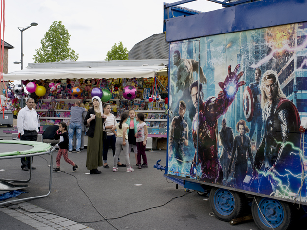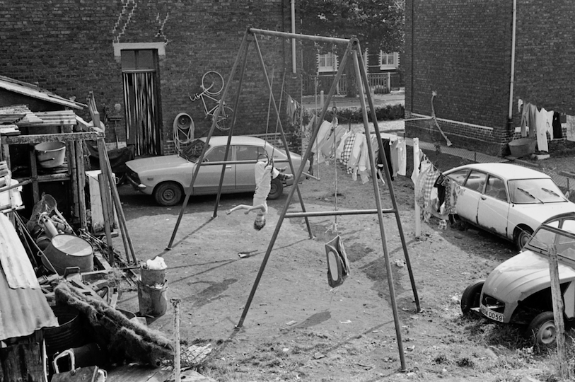 TG – Oui, la vraie différence est bien là. La plupart des photos actuelles ont été faites en extérieur (rues, jardins, espaces de loisirs, pas de porte..). J’en ai fait quand même quelques-unes en intérieur, mais je n’en ai gardé que deux (dont un intérieur sans personnages). En fait, pour pouvoir rentrer chez les gens, il vaut mieux quelqu’un ou un organisme qui serve de go-between. C’est ce qui s’était passé dans les années 80, notamment par l’entremise du Secours populaire, et aussi par un réseau de relations qui connaissaient bien le terrain. Mais j’avais pu aussi rentrer de moi-même assez facilement dans certaines maisons de mineurs. Ça n’a pas été le cas cette fois-ci. Je pense que la principale raison tient au fait que nous avons changé d’époque et qu’il y a désormais une sorte de méfiance un peu généralisée à l’égard du regard étranger que je représente, méfiance qui n’existait pas il y a trente ans. L’exemple le plus remarquable, si je puis dire, est celui des familles d’origine maghrébine. Celles auprès desquelles on m’avait introduit en 82 et 83, me recevaient comme pour un jour de fête : couscous, petits gâteaux, petites filles et petits garçons endimanchés etc. C’était un événement. Aujourd’hui, dans certaines communes du bassin minier, une majorité de jeunes femmes (je parle de celles qui ont des enfants) sont voilées. Leur rapport à l’image est évidemment complètement différent, y compris bien sûr de la part de leurs maris ou compagnons. Il est toujours possible de passer les obstacles, mais cela aurait nécessité un travail d’immersion que je n’ai pas eu le courage, l’envie ni le temps d’entreprendre. La seule personne qui m’ait vraiment servi de go-between lors des deux dernières résidences m’a permis de rencontrer une famille marocaine… Sauf que le jour du rendez-vous, l’homme était seul, la femme et les enfants avaient disparu (peut-être calfeutrés à l’étage) et que je suis reparti bredouille, mais avec un plat de gâteaux traditionnels que j’ai distribués autour de moi. Même expérience par l’intermédiaire d’une association de Chibanis, les anciens mineurs marocains : là aussi, on me met dans les pattes de trois anciens (du genre de ceux que j’avais photographiés avec une extrême facilité autrefois sur les carreaux de mines) et ils font déjà de la résistance pour que j’accède à leur jardin… Alors, rentrer dans leur maison, rencontrer leur femme, il n’en était pas question. Et ce n’est pas une question d’intégration, c’est simplement un changement de paradigme culturel.