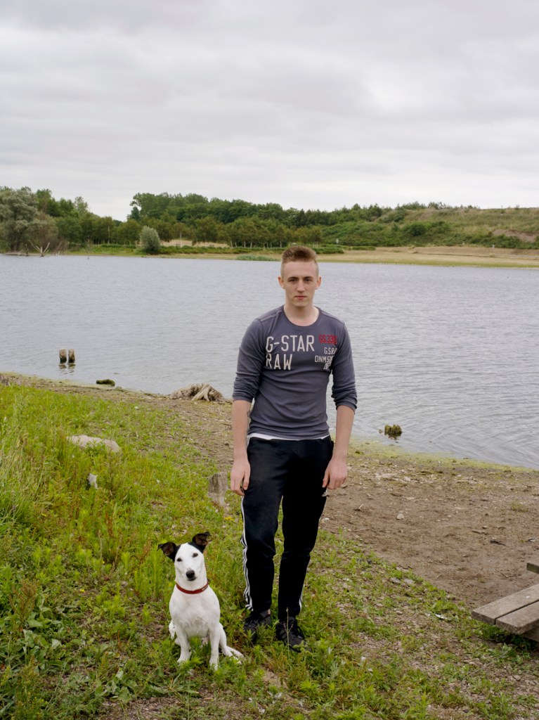 J’aime aussi ce portrait de Mathieu et de son chien Rox, surtout Rox d’ailleurs qui pose le mieux à mon avis, le regard rivé sur l’objectif. Il paraît plus à son aise que Mathieu, son maître. Cela me renvoie à ce que qu’écrit Jean-Christophe Bailly dans son livre, Le versant animal (Bayard, 2009), où cette question des animaux, de leur présence silencieuse, de leur condition avec nous les humains, ne saurait être plus longuement écartée. Pour reprendre les mots de Muriel Pic* : « Les animaux nous regardent, avec cette insistance muette, sans concept, qui me fait penser, parler, réfléchir à mon humanité ». Serait-ce trop dire que Rox – et Mathieu aussi – nous font réfléchir à notre humanité ? C’est pour moi une image bien dans l’esprit de l’Ange de l’Histoire de Walter Benjamin, l’artiste nous faisant observer ces personnages, et nous, face au lac artificiel constitué à la suite d’un affaissement, sur un ancien site minier, devant ce monde de ruines qui perdent du sens chaque jour un peu plus, les orbites noirs de Rox pouvant apparaître comme une métaphore de cette perte.