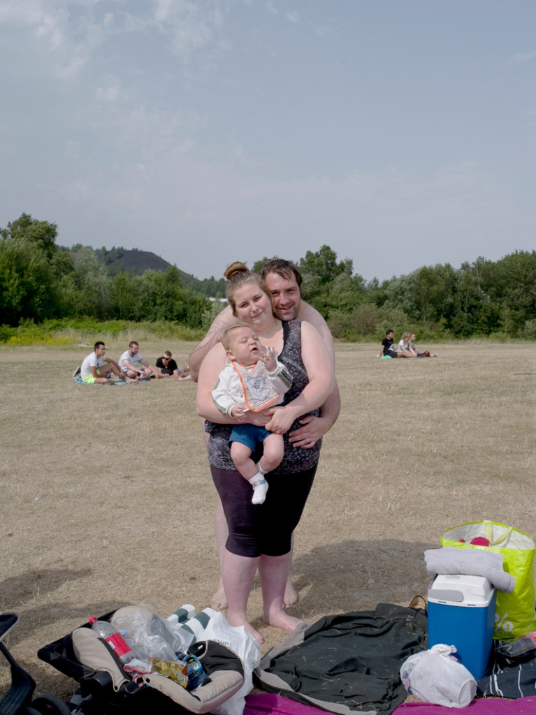 À bien y réfléchir, les portraits contemporains, en couleur, ne sont pas si différents. Ils ont bien entendu gardé leur dimension sociale : ils disent beaucoup de choses de ces gens-là vivant sur ce territoire-là. Et même si j’ai noté la plupart des noms des personnes photographiées, j’entends qu’elles restent anonymes, car, en fait, il s’agit moins d’individus précis que, d’une certaine manière, d’archétypes sociaux (du moins la plupart). Mais ce n’est pas pour autant que je les ai photographiés avec moins d’empathie. J’ai bien vu, lors du vernissage où sont passé des centaines de personnes pendant le week-end, le “succès“ d’une photo comme celle de ce couple obèse tenant dans leurs bras un bébé bien rond : les gens voyaient avant tout leur bonheur et les acceptaient tels qu’ils sont, parce que c’est une situation commune dans le bassin minier. Notre jugement (je parle de toi, de nous, des gens qui nous ressemblent) est biaisé par notre extériorité sociale et territoriale. Nous avons justement un jugement. Quoi qu’il en soit, je me suis toujours senti plus proche du portrait sociologique, façon Sander, que du portrait psychologique, ou du moins du portrait nécessitant du temps, de l’attention et de l’intimité censés percer les mystères de l’autre…