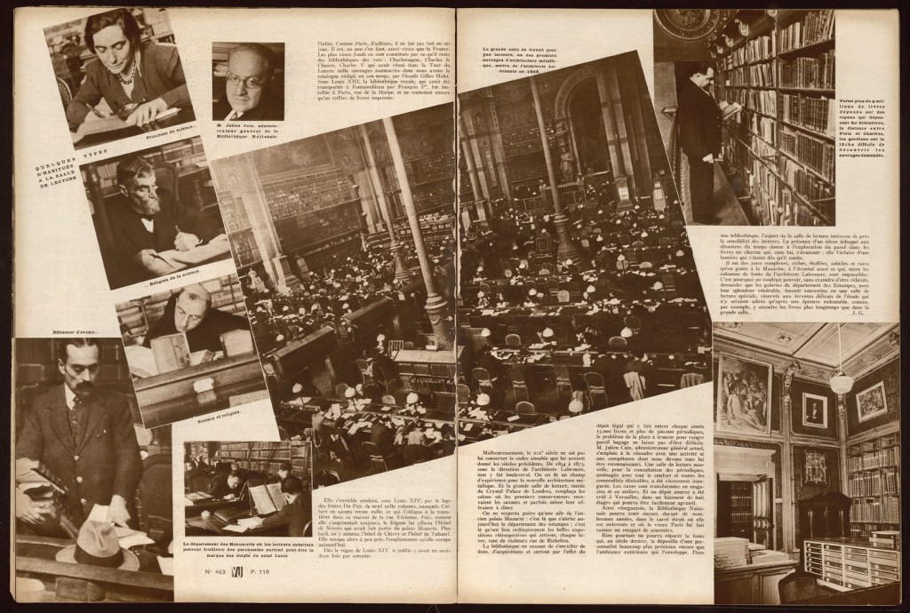 Le reportage sur la BN, « La première usine intellectuelle au monde » est écrit par Jean Galotti. Tout en saluant ce fleuron du patrimoine français, un auguste bâtiment aux cinq millions d’ouvrages, Galotti regrette qu’on en fit « un champ d’expériences pour la nouvelle architecture métallique ». À travers les photos de Gisèle Freund, on y voit donc la salle Labrouste et ses colonnettes en fonte, ses lampes aux abat-jours d’opaline, les rayonnages avec un bibliothécaire en action et quelques vues légendées de manière à privilégier le pittoresque : la femme aveugle, le moine studieux, le rond-de-cuir Troisième république. Gisèle Freund avait capturé quelques autres figures, l’habitué, l’homme qui dort, l’agent d’accueil… mais ce qui frappe dans la publication du magazine c’est bien l’absence de Walter Benjamin. Comment l’expliquer ?