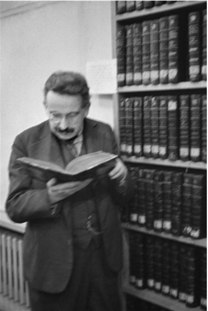 La photographe Gisèle Freund réalise ce portrait de Walter Benjamin au travail dans la salle des catalogues de la Bibliothèque nationale, rue de Richelieu, à Paris, en décembre 1936. Il fait partie d’une première série de huit photographies dont il reste le rouleau et la planche contact, conservés à l’IMEC (1), avec trois photographies du philosophe devant les rayonnages du Grand dictionnaire de la langue française et trois le montrant attablé, consultant des fiches bibliographiques.