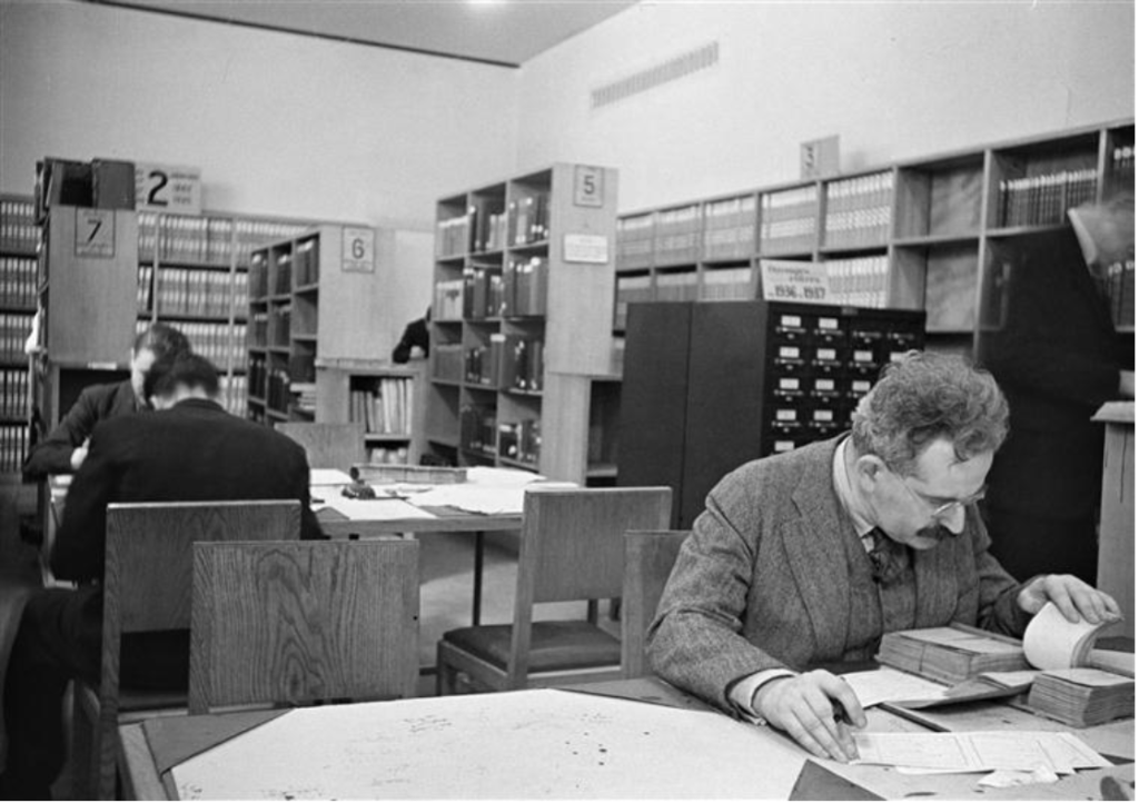 En 1936, elle n’est pas une photographe reconnue, n’ayant réalisé que peu d’opérations commerciales excepté un voyage dans le nord de l’Angleterre l’année précédente, une enquête sur la misère ouvrière qui ne paraît qu’en décembre dans Life Magazine. Est-ce parce qu’elle est désormais perçue comme une grande connaisseuse de la BN qu’elle reçoit la commande d’un reportage sur les bibliothèques parisiennes ? Le travail est destiné à l’un des pavillons français de l’Exposition internationale de 1937, celle où se firent face les énormités architecturales nazie et stalinienne. On ne sait qui fut intermédiaire de son mandat mais seulement cette anecdote qu’elle raconte plusieurs fois à propos de Julien Cains, l’administrateur de la BN. L’homme n’y connait rien en photographie mais il exige d’elle un matériel plus sérieux que son Leica, un objet technique pourtant remarquable. Elle semble accéder à ses désirs en se procurant aux Puces une vieille chambre avec son trépied pour 20 francs. On ignore combien de temps elle donne l’illusion d’un travail à la Eugène Atget qui promenait sur son dos dix ans plus tôt une lourde chambre en bois pour aller photographier les détails de quelque église ou hôtel particulier parisien.