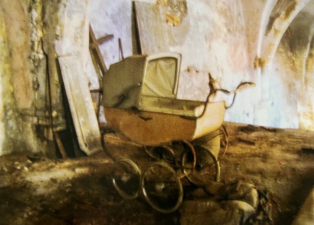 Un landau au centre d’une pièce, parmi d’autres objets délaissés, dans une vieille église sans fidèles, quelque part dans l’Hérault, un « berceau » aperçu dans la nécropole romaine des Alyscamps, en Arles, ces objets tentent de remplir un blanc sur lequel bute Agathe Ulivucci depuis toujours, « la vision impossible de l’enfant mort », ce frère mort-né, dont elle conte ailleurs la quête du lieu de naissance**. Plus loin c’est un tricycle au milieu d’une cour. Le fantôme du frère jamais grand qui erre dans les limbes.